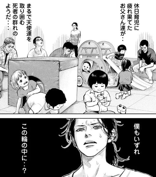 無邪気にはしゃぐ子供たちを取り囲むように、疲れ果てて青ざめたパパたちが下を向いていたのだ。