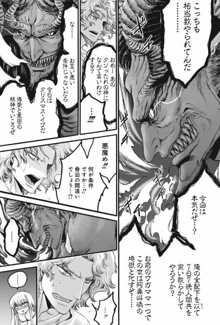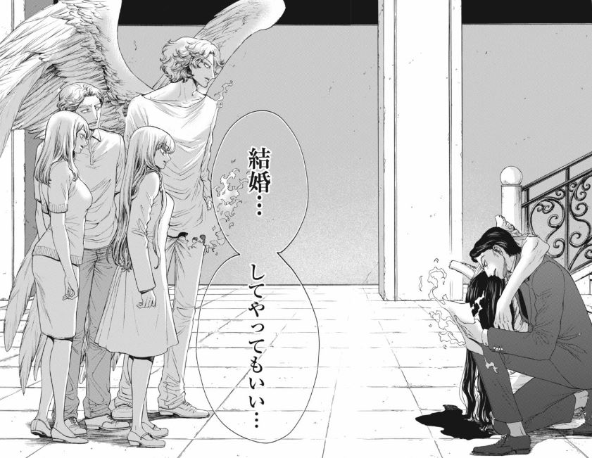 だがラファエルも意地を張り、悪魔との取引に応じるつもりがない姿勢を見せると、今度はサタンが黒い姿を現し、全人類をいつでも人質にできることで脅し、一人の天使として軽率な判断をしないようラファエルに責任の重さを知らしめ、よしのは人外のやり取りを黙って見守ることしかできずにいた。