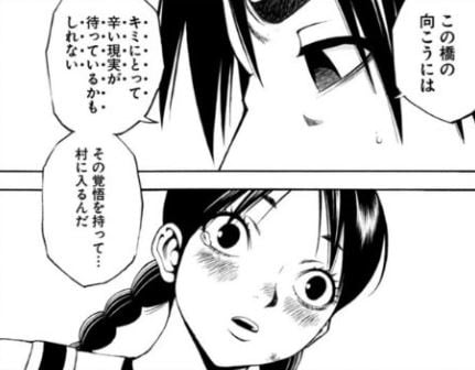 それでも志布は岩を登ってでも行こうとするので、蜂谷は放っておけなくなり、少し戻って山越えをして村に入るルートで一緒に行こうと説得した。