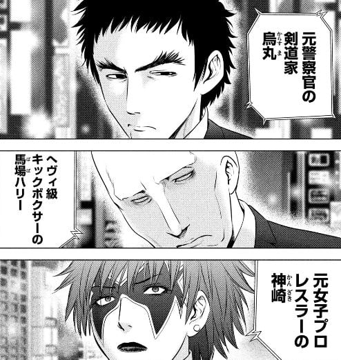 水野自身も柔道の心得があるが、ボディガードとして雇われている剣道家の烏丸、キックボクサーの馬場、女子プロレスラーの神崎の3人が特に手強い相手と思われた。