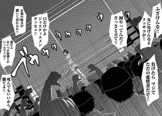 檻の中に入れられた天を見て、ジャスティスメンは再び立ち上がり、まだ正義を信じてくれていると思っている観客に向けて、自分が必ず勝つと呼びかけた。