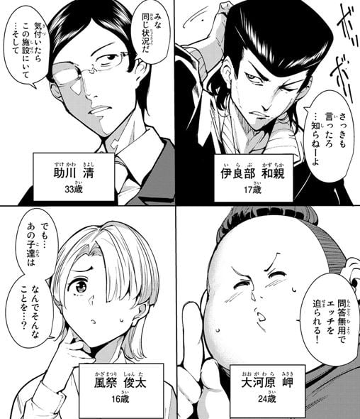 逆に最年長の助川は、三つ編みのおぼこい看守に襲われたのだが、潔癖症をこじらせていたのでシンプルに相手を傷つけて童貞を奪われずに済んだようだった。