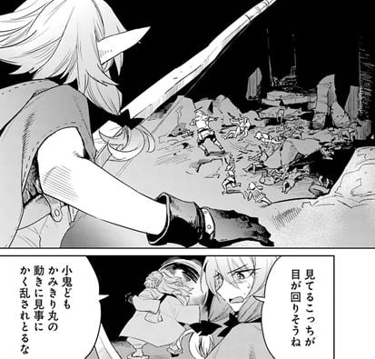 しかし、彼だけに任せるわけにもいかず、エルフは気を取り直して矢を番え、また一射で三匹仕留め、彼は残りの一匹に専念して顔面に拾った武器を叩き込んだ。