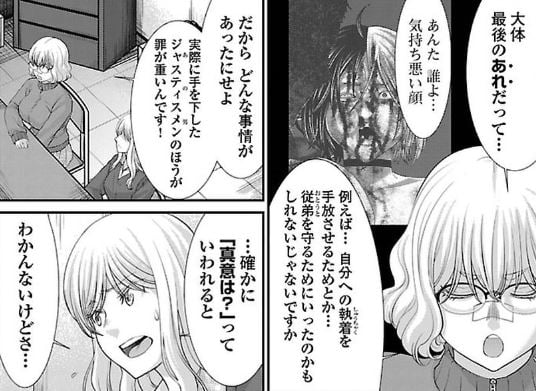 そう言われた三輪は否定できず、実際に二人の地元に行って調べてきた町谷に、天と正義のどちらの罪が重いと思っているのか訊いた。