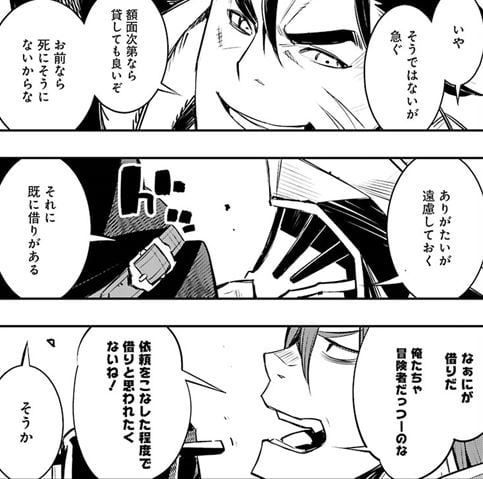 重戦士は死にそうにない彼に金を貸そうと言うが、律儀に彼は断り、すると槍使いが冒険者の何たるかを説く。