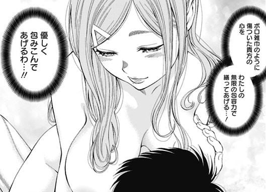 膝を抱える彼に自慢の巨乳を与え、乳首にしゃぶりつかせて母性でもって心を支配するどす黒い算段。