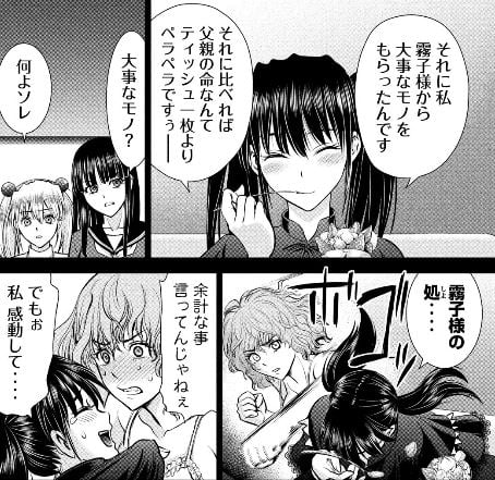 当然霧子の大事なものが気になった二人が訊くので仁奈は答えようとするが、ビッチキャラで通っている霧子はついさっきまで処女だったなどと知られるわけにはいかず、虜にした仁奈を殴って止めた。