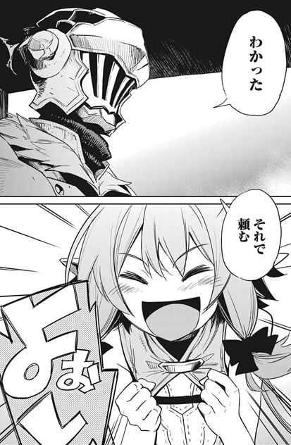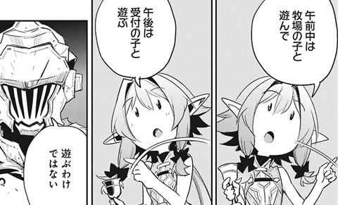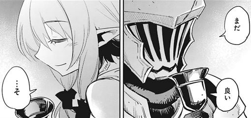 エルフの奢りでもテンションを上げることのない彼は何でもいいと言うので、彼女は奢り甲斐がなく、せめて兜を脱げという。