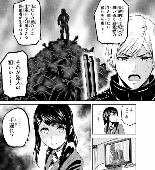 そうして避難民同士の殺し合いの末、生き残った進化情報の塊の新保菌者が、米軍をも返り討ちにできる武力を誇る存在になる。
