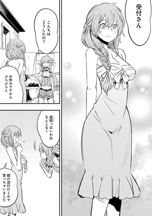 流行をどんどん作り出す人間にも感心したエルフは、ふと受付嬢が休日なのにギルドにいるのを疑問に思って投げかけると、もじもじ怪しい回答をするので訝しむ。