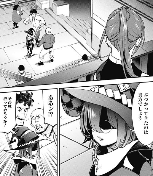 ウィッチハットに丸眼鏡に杖のTHE魔法使い少女はガラの悪い男に絡まれても一切ビビらず、強気に相手の非を責めている。