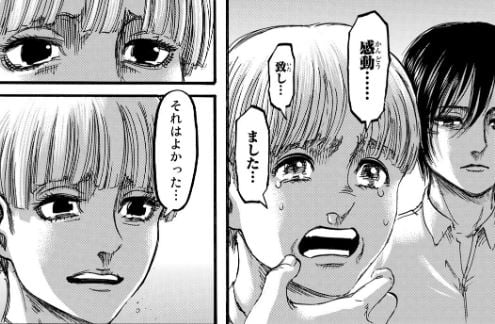 イェレナが静かに驚き声をかけると、アルミンは小刻みに震えながら涙を流し、その尊く壮大な話に感動したと答え、彼女を感動させた。
