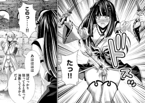 リリアが矢を放ち、ミサキが薙ぎ払うという攻防の稽古を積んでいたが、いきなり股間を狙われたミサキは手が追いつかず、大事なところを痛めてしまう。