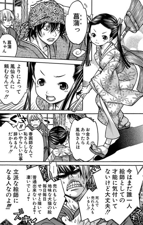 侘助の妹、菖蒲は鳳仙を慕ってはいたが春画師の仕事を貶し、グサグサと痛いところを邪気たっぷりで突きまくって追い詰める気の強い女童で、それも全て、いつか鳳仙が一角の男になると信じて見初めてもらおうと企んでのことだった。
