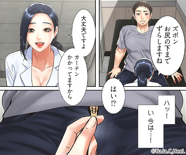 それであわよくばの期待をさせられる孝は、治療室で拒む間もなくズボンもずり下げられ、勢いよく飛び出したフル勃起〇ンポを見られて…